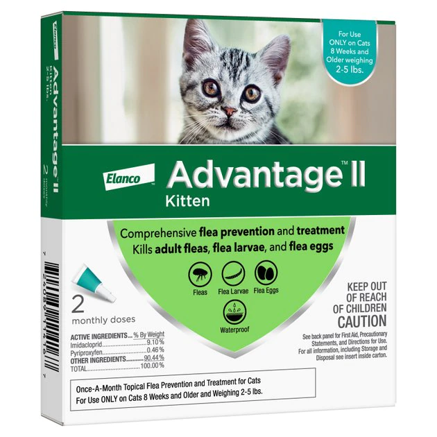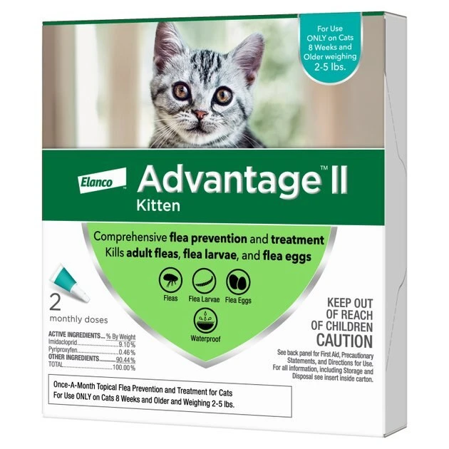 Help protect your tiny tabby from parasitic pests and the potentially harmful diseases they can transmit with Advantage II Flea Treatment for Kittens. This highly-effective, veterinarian-recommended treatment is specifically formulated to kill all life stages of fleas on contact with no painful biting required. With three-way protection that kills the eggs, larvae and adults, it breaks the flea life-cycle to help prevent re-infestation of your pet and your home. The waterproof formula continues working for up to four weeks, even after bathing; for use on kittens and cats 8 weeks or older and weighing between 2 and 5 pounds.