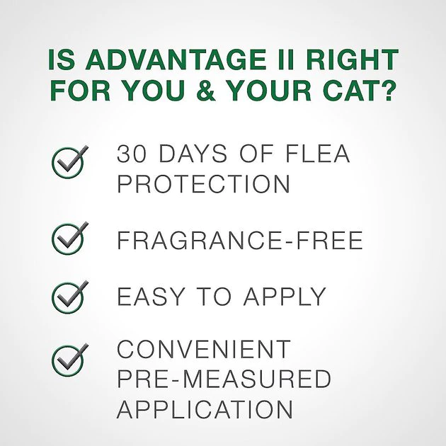 Advantage II flea prevention is applied to your cat topically, spreading over the skin and hair. It kills fleas through contact, so fleas do not have to bite your cat to die. With oral flea medications, fleas have to bite your cat and ingest the medication before they are killed.