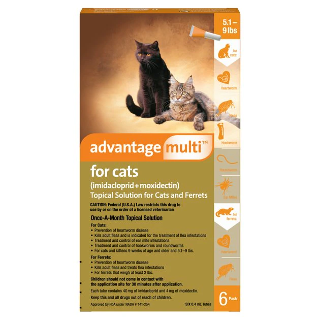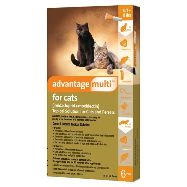 Advantage Multi for Cats can be used on cats at least 9 weeks old, weighing at least 2 pounds. The small cat size (5.1-9 lbs.) can be used for ferrets that weigh at least 2 pounds.