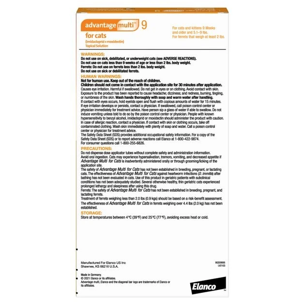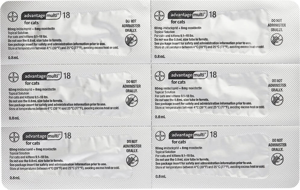 Do not dispense dose applicator tubes without complete safety and administration information. Avoid oral ingestion. The safety of Advantage Multi for Cats has not been established in breeding, pregnant, or lactating cats or ferrets. The effectiveness of Advantage Multi for Cats against heartworm infections (D. immitis) after bathing has not been evaluated in cats. Use of this product in geriatric pets with subclinical conditions has not been adequately studied. Several otherwise healthy, thin geriatric cats experienced prolonged lethargy and sleepiness after using this drug.