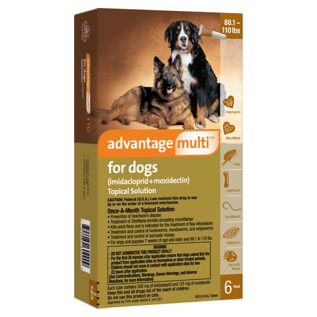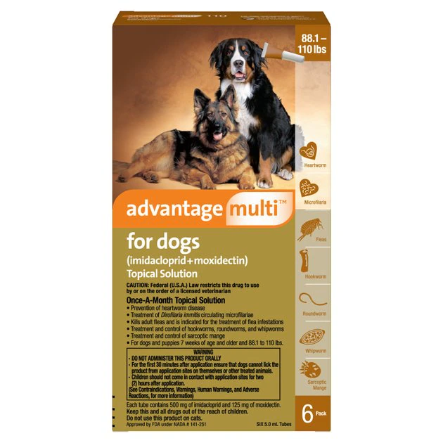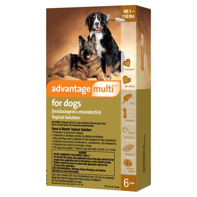 Advantage Multi for Dogs is indicated for the prevention of heartworm disease caused by Dirofilaria Immitis and the treatment of Dirofilaria Immitis circulating microfilariae in heartworm-positive dogs. Advantage Multi for Dogs kills adult fleas and is indicated for the treatment of flea infestations (Ctenocephalides felis). Advantage Multi for Dogs is indicated for the treatment and control of sarcoptic mange caused by Sarcoptes Scabiei Varcanis.