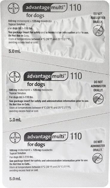 Do not dispense dose applicator tubes without complete safety and administration information. Use with caution in sick, debilitated, or underweight animals. The safety of Advantage Multi for Dogs has not been established in breeding, pregnant, or lactating dogs. The safe use of Advantage Multi for Dogs has not been established in puppies and dogs less than 7 weeks of age or less than 3 lbs. body weight. Prior to administration of Advantage Multi for Dogs, dogs should be tested for existing heartworm infection. At the discretion of the veterinarian, infected dogs should be treated with an adulticide to remove adult heartworms. The safety of Advantage Multi for Dogs has not been evaluated when administered on the same day as an adulticide. Advantage Multi for Dogs is not effective against adult D. Immitis.