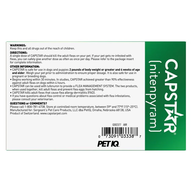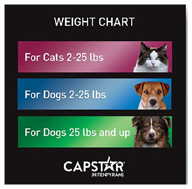 Capstar (nitenpyram) is a fast-acting flea treatment for dogs and cats that kills adult fleas before they can start an infestation. Capstar is an oral treatment that is convenient to deliver.