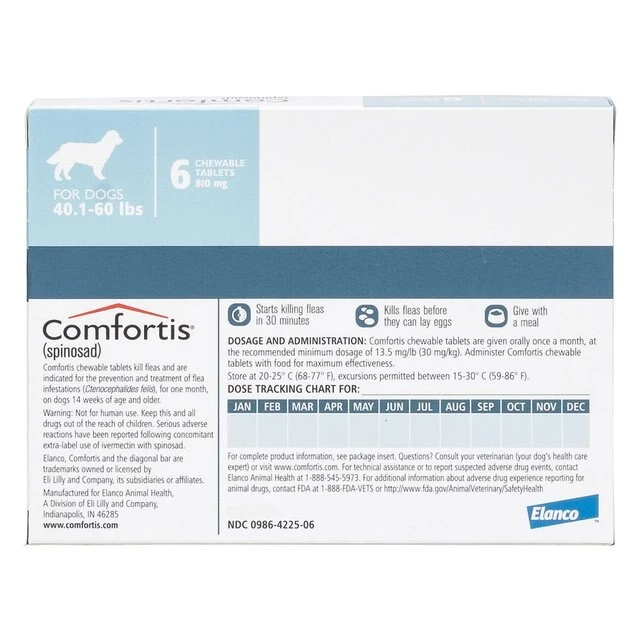 Dose varies based on pet’s weight. Use according to your veterinarian’s instructions. Comfortis is generally given once a month, but you should always follow your veterinarian’s directions. It is recommended to give Comfortis chewable tablets with food.