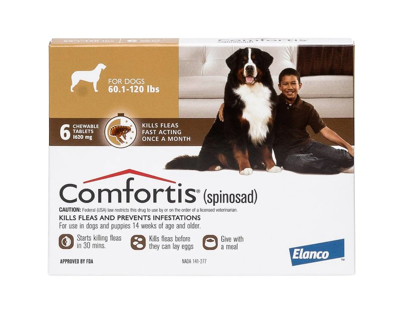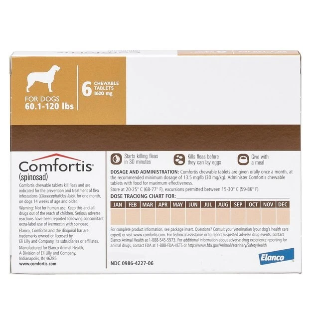 They’re beef-flavored, chewable tablets you give to your dog to kill fleas and prevent flea infestations for one month. Comfortis chewable tablets are recommended for monthly use in dogs 14 weeks of age or older and 5 lbs of body weight or greater.