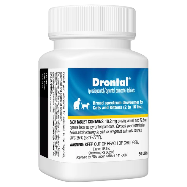Knock out parasites and help your pet feel better with Drontal tablets. Specially formulated for cats and kittens, Drontal is recommended by veterinarians to help treat a variety of intestinal worms, including tapeworms, hookworms and large roundworms. These broad-spectrum tablets are scored for accurate dosing and can easily be crumbled and mixed into your cat’s favorite food for easy administration.