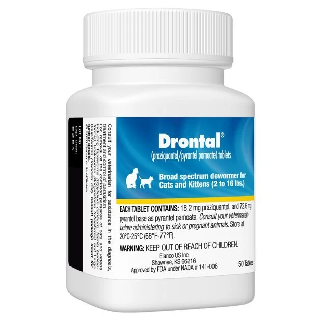 Knock out parasites and help your pet feel better with Drontal tablets. Specially formulated for cats and kittens, Drontal is prescribed by veterinarians to help treat a variety of intestinal worms, including tapeworms, hookworms and large roundworms. These broad-spectrum tablets are scored for accurate dosing and can easily be crumbled and mixed into your cat’s favorite food for easy administration. This item may also be purchased without a prescription and is sold as the complete bottle with 50 tablets.