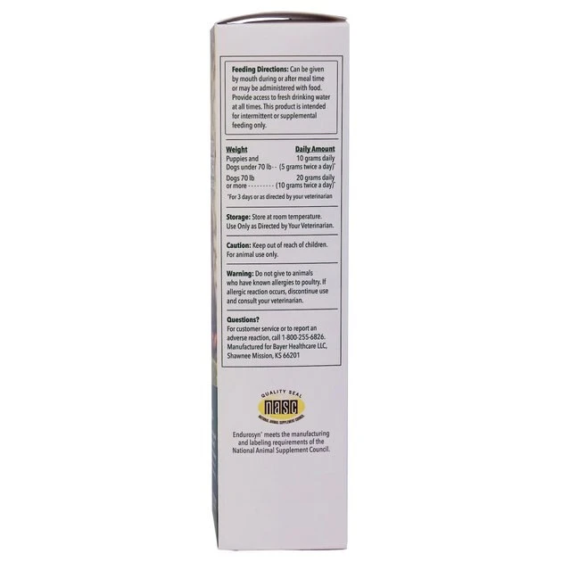 Endurosyn is designed for use during short stints of stress or transition (traveling, kenneling, etc.) that can cause GI upset. It contains probiotics and additional ingredients such as electrolytes, vitamins and concentrated energy sources to help support the protective layers of the bowel, as well as maintain proper intestinal pH.