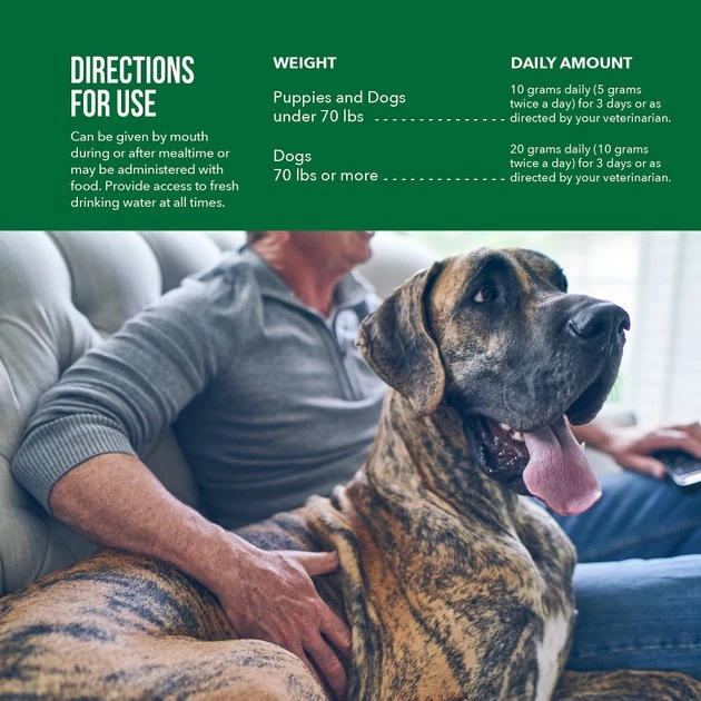 | Dogs 70 lbs or more | 20 grams daily (10 grams twice a day) for 3 days or as directed by your veterinarian. |