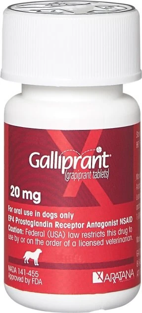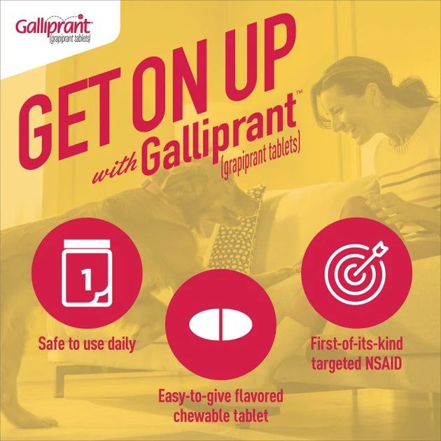 Galliprant (grapiprant tablets) is a first-of-its-kind, non-steroidal anti-inflammatory (NSAID) that uses targeted action to treat canine osteoarthritis pain and inflammation. The convenient, flavored chewable tablet is safe to use daily. Your veterinarian may start treatment for your dog as early as 9 months of age and as soon as your dog is diagnosed with osteoarthritis to help keep your dog doing the things he loves.
