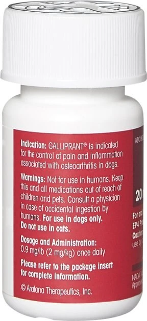 Not for use in humans. For use in dogs only. Keep out of reach of children and pets. Monitoring is recommended if used long term. Should not be used in dogs who are allergic to grapiprant or with other anti-inflammatory drugs. The safe use of Galliprant has not been studied in dogs younger than 9 months of age and less than 8 pounds, breeding, pregnant or lactating dogs, or dogs with heart disease. The most common adverse reactions were vomiting, diarrhea, decreased appetite and tiredness. View full product label for complete safety information or contact your veterinarian.