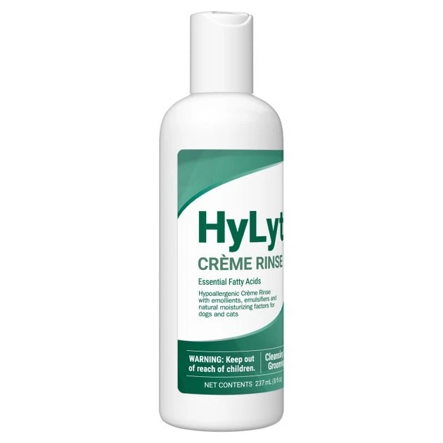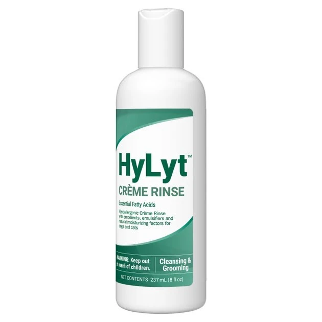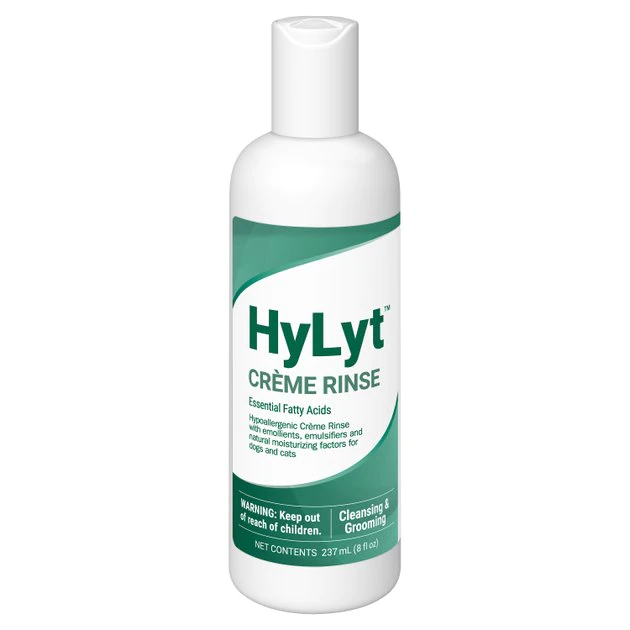 HyLyt Creme Rinse for Dogs & Cats is a luxurious and soap-free formula enhanced with essential fatty acids and containing emollients, humectants and other natural moisturizing factors to condition and hydrate the skin for dogs and cats. This rinse can be used as an after-bath creme to assist with the reduction of static electricity, tangles and snarls, so your pet’s coat stays healthy and smooth.