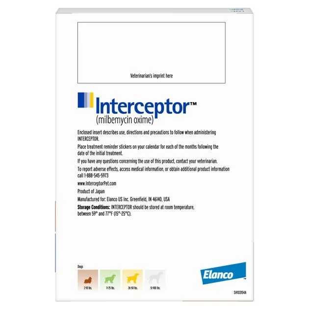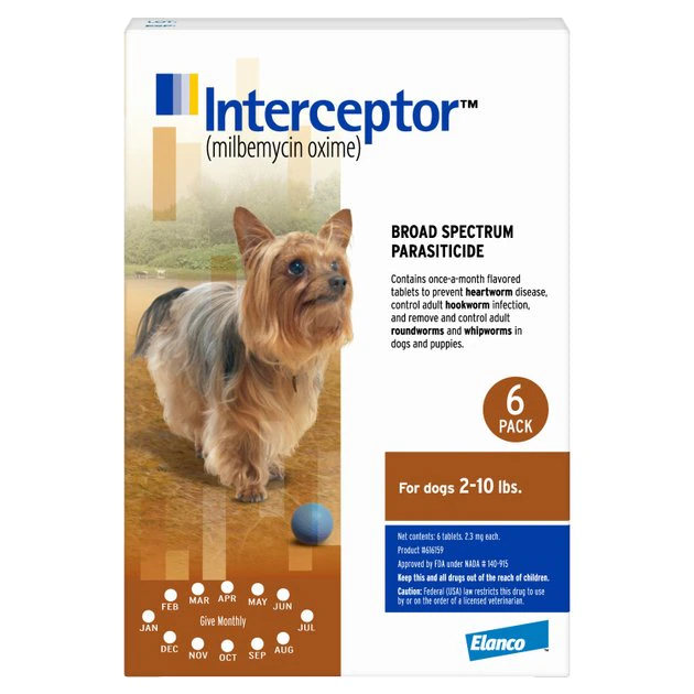 Interceptor is given orally, once a month. Consult your veterinarian for proper dosing instructions. Do not use in puppies less than four weeks of age and less than two pounds. The first dose should be given within one month after first exposure to mosquitoes and continue regular use until at least one month after the end of mosquito season.