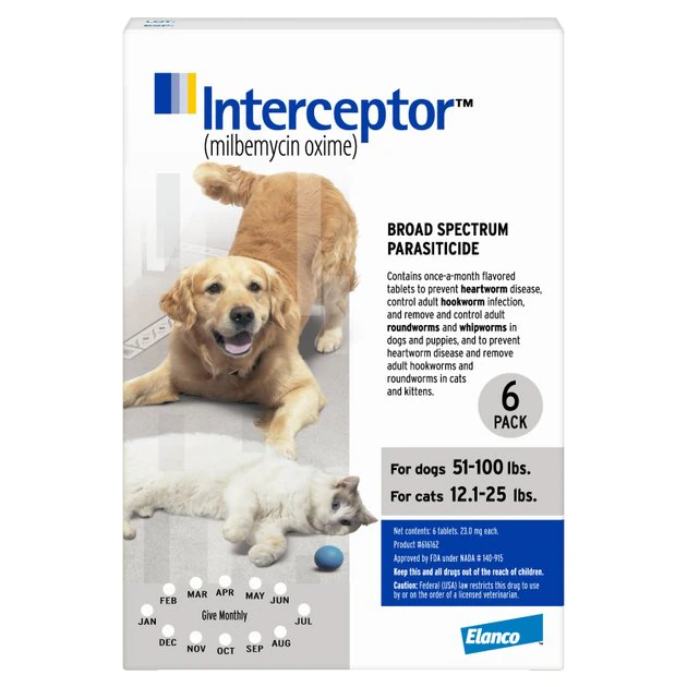 Interceptor Flavor Tabs are a palatable once-a-month tablet that prevents heartworm disease, controls adult hookworms, and removes and controls adult roundworms and whipworm infections in dogs. Interceptor for cats is the only oral monthly preventative that protects against heartworms and removes adult roundworms and adult hookworms.