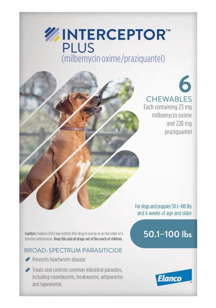 Interceptor Plus (milbemycin oxime/praziquantel) is a chewable tablet flavored with real chicken that you give to your dog once a month, every month. Its overall acceptability is 96.6%, which makes dosing easy.