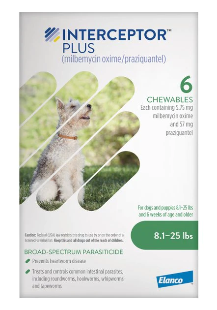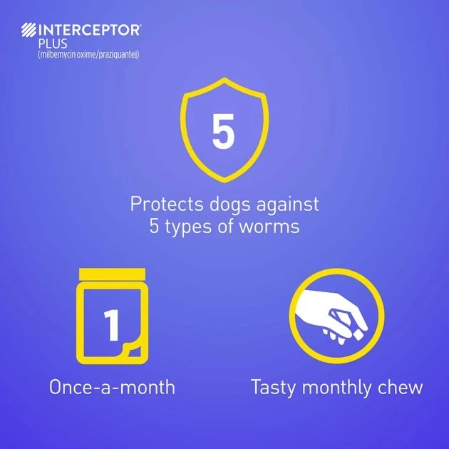 Interceptor Plus (milbemycin oxime/praziquantel) is a chewable tablet flavored with real chicken that you give to your dog once a month, every month. Its overall acceptability is 96.6%, which makes dosing easy.