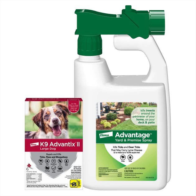 Help protect your furbaby and family from parasitic pests and the potentially harmful diseases they can transmit with K9 Advantix II Flea & Tick Spot Treatment for Dogs, 21-55 lbs + Advantage Yard & Premise Spray. The veterinarian-recommended topical treatment is specifically formulated to repel and kill fleas, ticks and mosquitoes on contact. It further kills all life stages of fleas to prevent re-infestation, and even kills lice while also repelling biting flies. Meanwhile, the EPA-registered outdoor spray works to kill fleas, ticks and deer ticks on contact. This easy-to-use spray attaches to a standard garden hose (sold separately) for fast and convenient application to your lawn, vegetation, deck, patio and home perimeter.