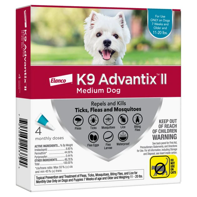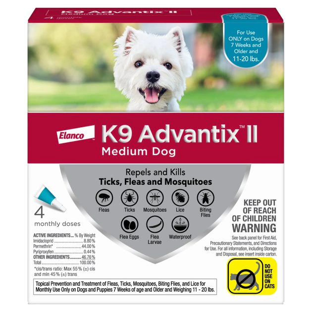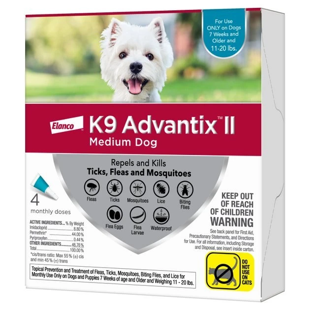 Help protect your precious pooch from parasitic pests and the potentially harmful diseases they can transmit with K9 Advantix II Flea & Tick Treatment for Medium Dogs. This broad-spectrum, veterinarian-recommended treatment is specifically formulated to repel and kill fleas, ticks and mosquitoes on contact with no painful biting required. It further kills all life stages of fleas to prevent re-infestation, and even kills lice while also repelling biting flies. The waterproof formula for puppies and dogs 7 weeks or older and weighing between 11 and 20 pounds continues working for up to four weeks, even after bathing or swimming.