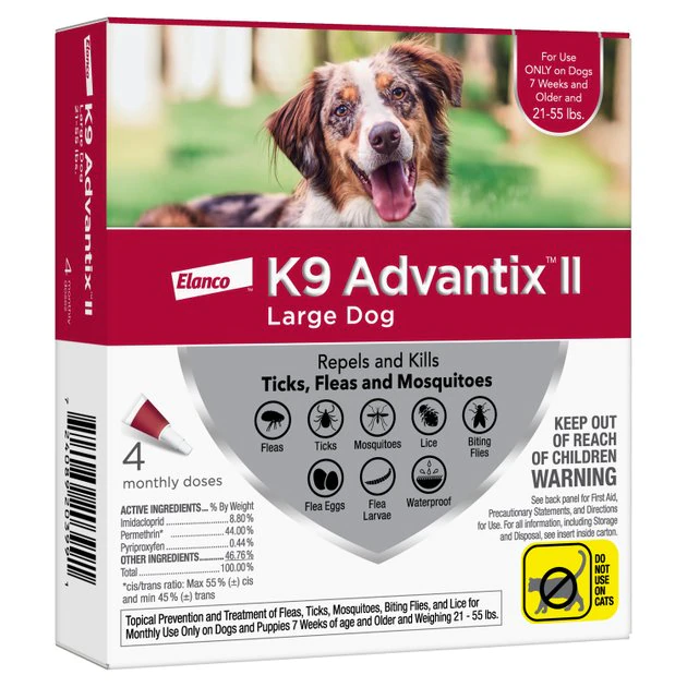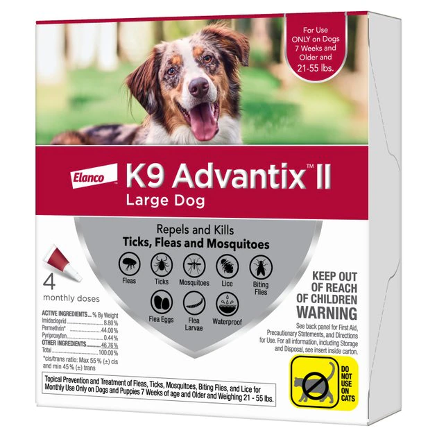 Help protect your precious pooch from parasitic pests and the potentially harmful diseases they can transmit with K9 Advantix II Flea & Tick Treatment for Large Dogs. This broad-spectrum, veterinarian-recommended treatment is specifically formulated to repel and kill fleas, ticks and mosquitoes on contact with no painful biting required. It further kills all life stages of fleas to prevent re-infestation, and even kills lice while also repelling biting flies. The waterproof formula for puppies and dogs 7 weeks or older and weighing between 21 and 55 pounds continues working for up to four weeks, even after bathing or swimming.