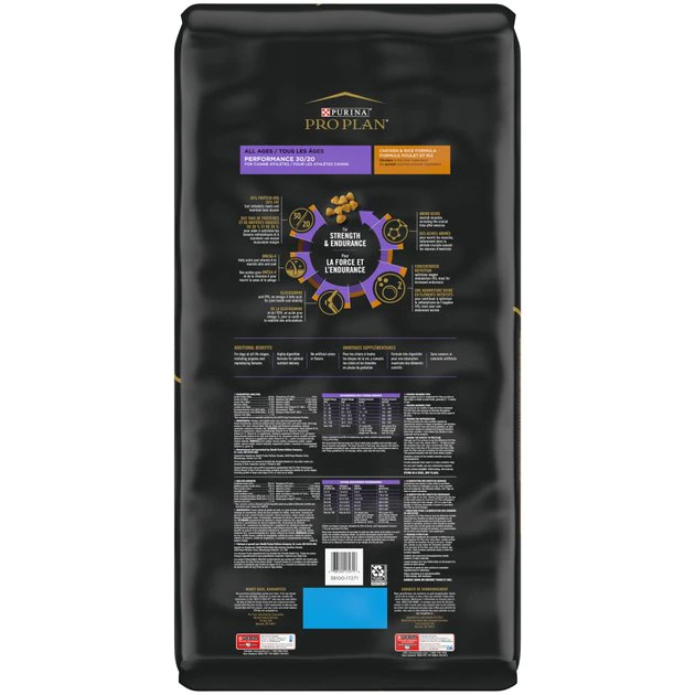 Support your dog’s active lifestyle with Purina Pro Plan High Calorie High Protein Dry Dog Food Sport Performance 30/20 Chicken and Rice Formula. Featuring real chicken as the #1 ingredient, this Purina Pro Plan adult dog food is expertly formulated with 30% protein and 20% fat to fuel active dogs’ metabolic needs and help them maintain lean muscle. It contains concentrated nutrition to boost oxygen metabolism (VO2 max) for increased endurance. Brain-support nutrients DHA, EPA, B vitamins, arginine and antioxidants promote cognitive health. Plus, it contains high-quality protein to support a healthy heart, as well as amino acids to nourish muscles, including the crucial time following exercise. And because your dog should always look his best, this formula includes vitamin A and omega-6 fatty acids for a healthy coat. Every Purina Pro Plan dry dog food is rigorously tested for quality and safety and proudly manufactured at Purina-owned U.S. facilities.