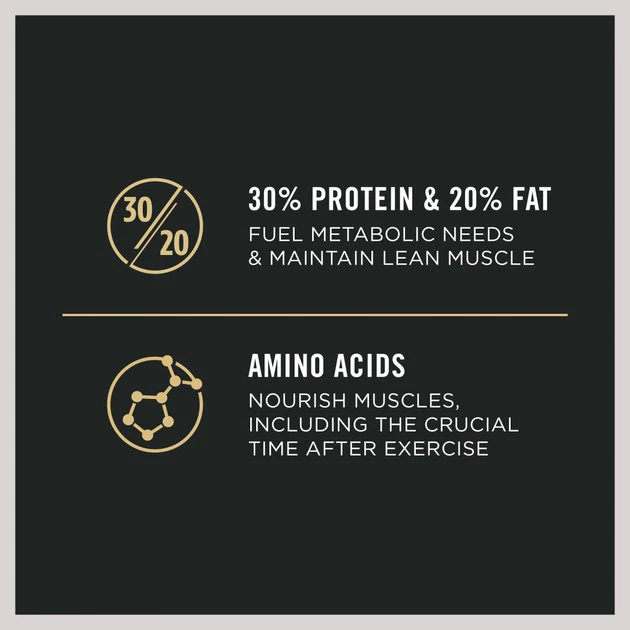 - Contains 30% protein and 20% fat to help fuel metabolic needs and maintain lean muscle.