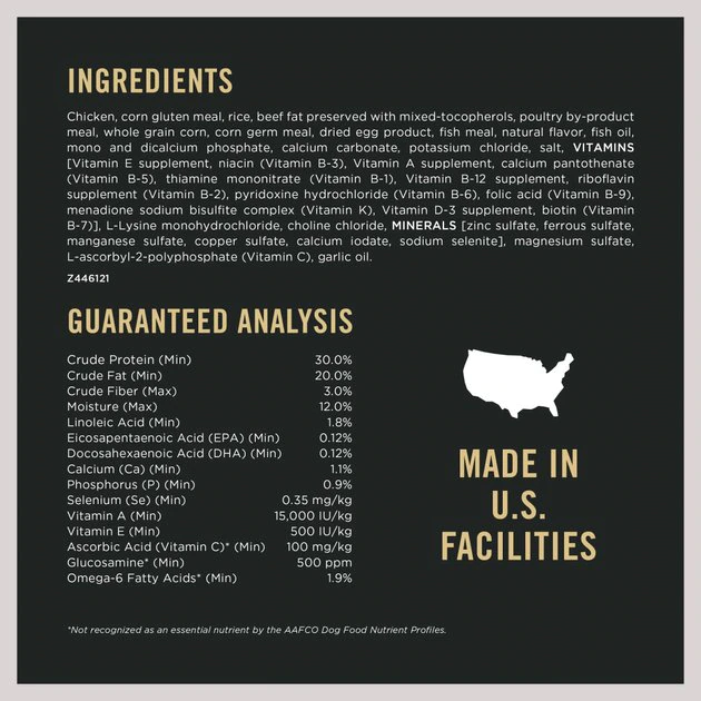 Chicken, Corn Gluten Meal, Rice, Beef Fat Preserved With Mixed-Tocopherols, Poultry By-Product Meal, Whole Grain Corn, Corn Germ Meal, Dried Egg Product, Fish Meal, Natural Flavor, Fish Oil, Mono And Dicalcium Phosphate, Calcium Carbonate, Potassium Chloride, Salt, VITAMINS [Vitamin E Supplement, Niacin (Vitamin B-3), Vitamin A Supplement, Calcium Pantothenate (Vitamin B-5), Thiamine Mononitrate (Vitamin B-1), Vitamin B-12 Supplement, Riboflavin Supplement (Vitamin B-2), Pyridoxine Hydrochloride (Vitamin B-6), Folic Acid (Vitamin B-9), Menadione Sodium Bisulfite Complex (Vitamin K), Vitamin D-3 Supplement, Biotin (Vitamin B-7)], L-Lysine Monohydrochloride, Choline Chloride, MINERALS [Zinc Sulfate, Ferrous Sulfate, Manganese Sulfate, Copper Sulfate, Calcium Iodate, Sodium Selenite], Magnesium Sulfate, L-Ascorbyl-2-Polyphosphate (Vitamin C), Garlic Oil. Z446121