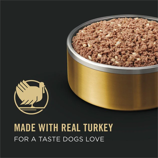 Meet the unique nutritional needs of your senior pooch with Purina Pro Plan Adult 7+ Complete Essentials Turkey & Rice Entree Wet Dog Food. Pet nutritionists carefully pick each high-quality ingredient for a specific purpose. Real turkey goes in, helping supply loads of protein in every serving to help him maintain an ideal body condition as he gets older. The yummy formula helps support him on his daily adventures as he jumps and plays. Plus, this high protein wet dog food is made with no corn, soy or wheat to meet your ingredient preferences for the meals you serve your furry friend. Best of all, your canine buddy gets a high quality dog food packed with wholesome goodness to support his nose-to-tail well-being into his golden years. Purina proudly produces this turkey and rice ground dog food entree in Purina-owned, U.S. facilities.