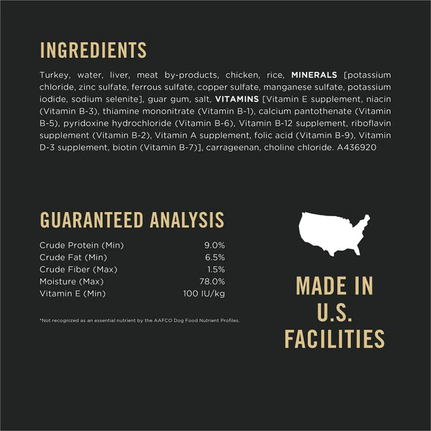 Turkey, Water, Liver, Meat By-Products, Chicken, Rice, Minerals [Potassium Chloride, Zinc Sulfate, Ferrous Sulfate, Copper Sulfate, Manganese Sulfate, Potassium Iodide, Sodium Selenite], Guar Gum, Salt, Vitamins [Vitamin E Supplement, Niacin (Vitamin B-3), Thiamine Mononitrate (Vitamin B-1), Calcium Pantothenate (Vitamin B-5), Pyridoxine Hydrochloride (Vitamin B-6), Vitamin B-12 Supplement, Riboflavin Supplement (Vitamin B-2), Vitamin A Supplement, Folic Acid (Vitamin B-9), Vitamin D-3 Supplement, Biotin (Vitamin B-7)], Carrageenan, Choline Chloride.