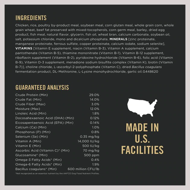 Chicken, Rice, Poultry By-Product Meal, Soybean Meal, Corn Gluten Meal, Whole Grain Corn, Whole Grain Wheat, Beef Fat Preserved With Mixed-Tocopherols, Corn Germ Meal, Barley, Dried Egg Product, Fish Meal, Natural Flavor, Glycerin, Fish Oil, Wheat Bran, Calcium Carbonate, Soybean Oil, Salt, Potassium Chloride, Mono And Dicalcium Phosphate, Minerals [Zinc Proteinate, Manganese Proteinate, Ferrous Sulfate, Copper Proteinate, Calcium Iodate, Sodium Selenite], Vitamins [Vitamin E Supplement, Niacin (Vitamin B-3), Vitamin A Supplement, Calcium Pantothenate (Vitamin B-5), Thiamine Mononitrate (Vitamin B-1), Vitamin B-12 Supplement, Riboflavin Supplement (Vitamin B-2), Pyridoxine Hydrochloride (Vitamin B-6), Folic Acid (Vitamin B-9), Vitamin D-3 Supplement, Menadione Sodium Bisulfite Complex (Vitamin K), Biotin (Vitamin B-7)], Choline Chloride, L-Ascorbyl-2-Polyphosphate (Vitamin C), Dried Bacillus Coagulans Fermentation Product, Dl-Methionine, L-Lysine Monohydrochloride, Garlic Oil. G448620.