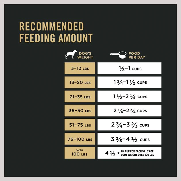 We recommend that you keep your dog in ideal body condition and not allow your dog to become overweight. The exact amount of food your dog requires will need to be adjusted according to age, activity and environment. But a good place to start is with these guidelines for an average, active, adult dog fed once daily. Provide adequate fresh water in a clean container daily.