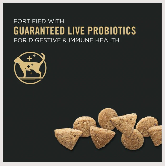 Feed your cat targeted nutrition when you serve Purina Pro Plan Adult Chicken & Egg Formula Grain-Free Dry Cat Food. This grain-free cat food features multiple high-quality sources of protein, including real chicken as the first ingredient, and every high-quality ingredient is carefully selected for a specific purpose. Made without corn, wheat or soy, this super-premium dry cat food delivers the grain-free meal option you want for your favorite feline. The highly digestible, natural dry cat food helps to promote optimal nutrient absorption within your cat’s body, and antioxidants help support her immune system health. We fortify this dry cat food formula with guaranteed live probiotics for digestive and immune health. Fuel your cat’s reflexes and remarkable agility when you make this Purina Pro Plan dry cat food part of her daily feeding routine, and give her the nourishment she needs to thrive.