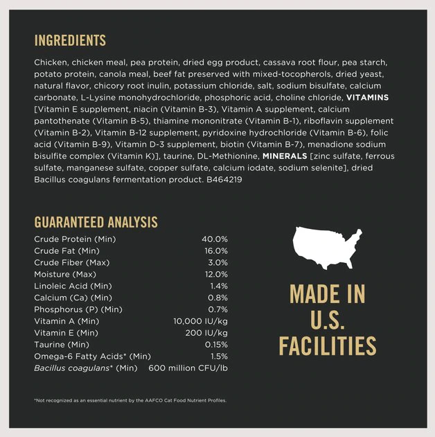 Chicken, Chicken Meal, Pea Protein, Dried Egg Product, Cassava Root Flour, Pea Starch, Potato Protein, Canola Meal, Beef Fat Preserved With Mixed-tocopherols, Dried Yeast, Natural Flavor, Chicory Root Inulin, Potassium Chloride, Salt, Sodium Bisulfate, Calcium Carbonate, L-lysine Monohydrochloride, Phosphoric Acid, Choline Chloride, Vitamins [Vitamin E Supplement, Niacin (Vitamin B-3), Vitamin A Supplement, Calcium Pantothenate (Vitamin B-5), Thiamine Mononitrate (Vitamin B-1), Riboflavin Supplement (Vitamin B-2), Vitamin B-12 Supplement, Pyridoxine Hydrochloride (Vitamin B-6), Folic Acid (Vitamin B-9), Vitamin D-3 Supplement, Biotin (Vitamin B-7), Menadione Sodium Bisulfite Complex (Vitamin K)], Taurine, Dl-methionine, Minerals [Zinc Sulfate, Ferrous Sulfate, Manganese Sulfate, Copper Sulfate, Calcium Iodate, Sodium Selenite], Dried Bacillus Coagulans Fermentation Product. B464219