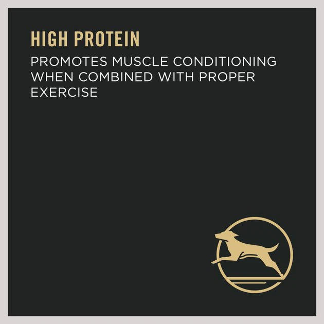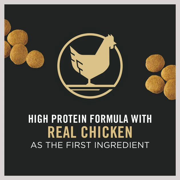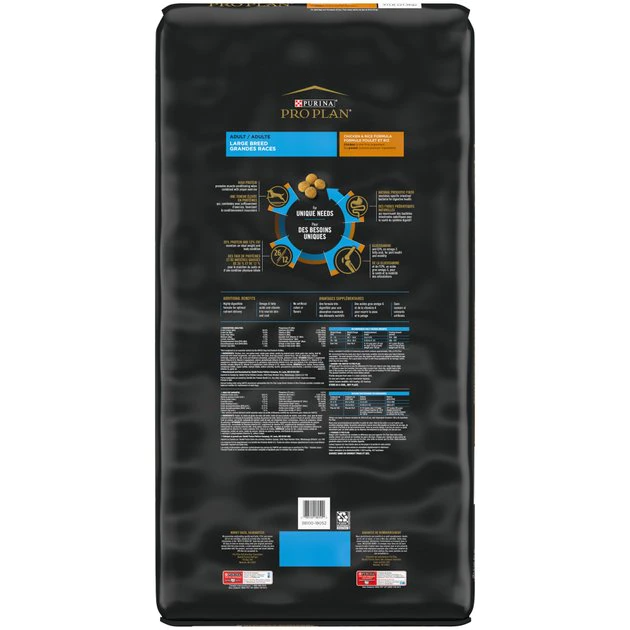 Answer your large breed dog’s specific nutritional needs with Purina Pro Plan Brand Dog Food Large Breed Chicken and Rice Formula adult dry dog food. With real chicken as the #1 ingredient, this large breed dog food helps provide protein, an essential nutritional building block within your dog’s body. Plus, this highly digestible formula promotes nutrient bioavailability, which means it is formulated to support optimal nutrient absorption. With 26% protein and 12% fat in every serving of this dog food for large breeds, this formula helps maintain large breed dogs’ ideal body condition. Every high-quality ingredient is carefully chosen for a specific nutritional or functional purpose, so your canine companion gets the wholesome goodness you expect from a trusted pet food brand in every delicious bowl. Formulated for large breed dogs weighing 50 pounds and over, this super-premium dry dog food offers 100% complete and balanced nutrition for adult dogs.