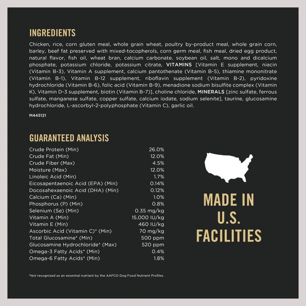 Chicken, Rice, Corn Gluten Meal, Whole Grain Corn, Poultry By-product Meal (Source Of Glucosamine), Whole Grain Wheat, Barley, Beef Fat Preserved With Mixed-tocopherols, Corn Germ Meal, Fish Meal (Source Of Glucosamine), Dried Egg Product, Natural Flavor, Fish Oil, Wheat Bran, Calcium Carbonate, Soybean Oil, Salt, Potassium Chloride, Mono And Dicalcium Phosphate, Potassium Citrate, Vitamins [Vitamin E Supplement, Niacin (Vitamin B-3), Vitamin A Supplement, Calcium Pantothenate (Vitamin B-5), Thiamine Mononitrate (Vitamin B-1), Vitamin B-12 Supplement, Riboflavin Supplement (Vitamin B-2), Pyridoxine Hydrochloride (Vitamin B-6), Folic Acid (Vitamin B-9), Menadione Sodium Bisulfite Complex (Vitamin K), Vitamin D-3 Supplement, Biotin (Vitamin B-7)], Choline Chloride, Minerals [Zinc Sulfate, Ferrous Sulfate, Manganese Sulfate, Copper Sulfate, Calcium Iodate, Sodium Selenite], Glucosamine Hydrochloride, L-ascorbyl-2-polyphosphate (Vitamin C), Dried Bacillus Coagulans Fermentation Product, Garlic Oil. L445119