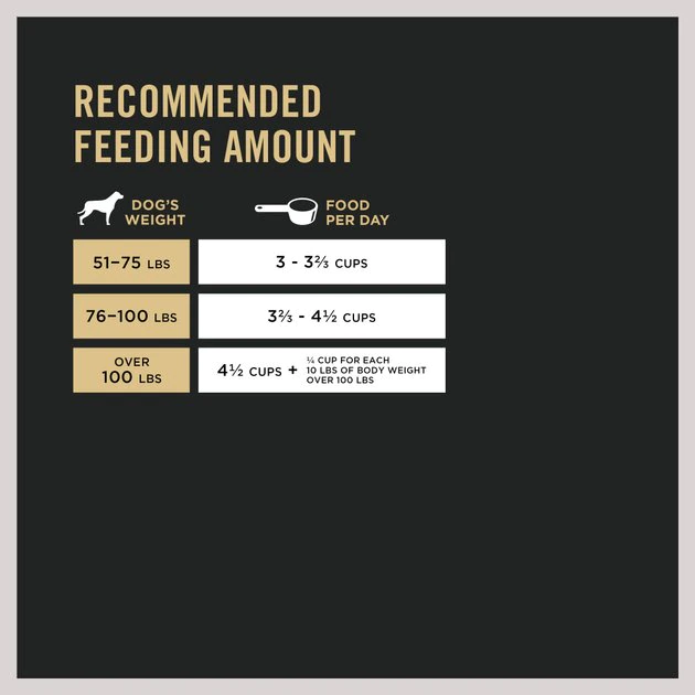 We recommend that you keep your dog in ideal body condition and not allow your dog to become overweight. The exact amount of food your dog requires will need to be adjusted according to age, activity and environment. But a good place to start is with these guidelines for an average, active, adult dog fed once daily. Provide adequate fresh water in a clean container daily.