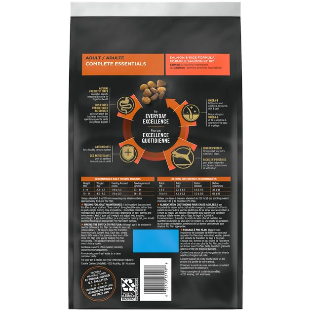 Give your cat the high-quality meals and advanced nutrition she deserves with Purina Pro Plan COMPLETE ESSENTIALS Salmon and Rice Formula adult dry cat food. This cat food kibble features guaranteed live probiotics to promote digestive health and delivers high-quality protein, including real salmon as the first ingredient. Every high-quality ingredient in this dry cat food is carefully chosen for a specific purpose, so you can feel confident every time you fill your feline’s dish. Vitamin A and linoleic acid, an omega fatty acid, help to nourish her skin and coat, while antioxidants help support her immune system health, so your cat looks and feels her best every day. With a taste and texture sure to capture her attention, this cat food formula delivers the sensory experience cats love. Tend to her nutritional needs and please her palate with this dry cat food as part of her daily routine.