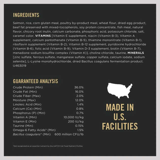 Salmon, Rice, Corn Gluten Meal, Poultry By-Product Meal, Wheat Flour, Dried Egg Product, Beef Fat Preserved With Mixed-tocopherols, Soy Protein Concentrate, Fish Meal, Natural Flavor, Chicory Root Inulin, Calcium Carbonate, Phosphoric Acid, Potassium Chloride, Salt, Caramel Color, Vitamins [Vitamin E Supplement, Niacin (Vitamin B-3), Vitamin A Supplement, Calcium Pantothenate (Vitamin B-5), Thiamine Mononitrate (Vitamin B-1), Riboflavin Supplement (Vitamin B-2), Vitamin B-12 Supplement, Pyridoxine Hydrochloride (Vitamin B-6), Folic Acid (Vitamin B-9), Vitamin D-3 Supplement, Biotin (Vitamin B-7), Menadione Sodium Bisulfite Complex (Vitamin K)], Choline Chloride, Taurine, Minerals [Zinc Sulfate, Ferrous Sulfate, Manganese Sulfate, Copper Sulfate, Calcium Iodate, Sodium Selenite], L-lysine Monohydrochloride, Dried Bacillus Coagulans Fermentation Product. U463019.