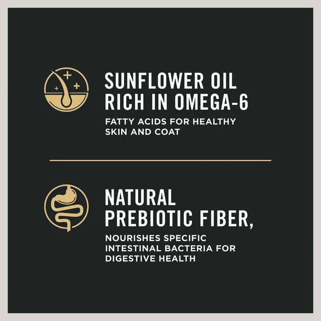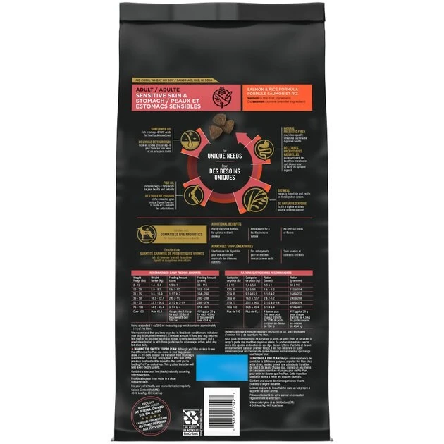 Tend to your furry friend with Purina Pro Plan Salmon & Rice Formula. This high-protein dry food for adult dogs is formulated to nurture your sidekick’s sensitive skin and stomach. It features real, nutrient-rich salmon as the very first ingredient in a highly-digestible recipe with rice and oatmeal. This dry dog food is fortified with live probiotics and prebiotic fiber for your pet pal’s digestive and immune health. It also contains omega-6 fatty acids and vitamin A to help nourish your cuddly companion’s skin and coat and omega-3 fatty acids to support healthy joints and mobility.