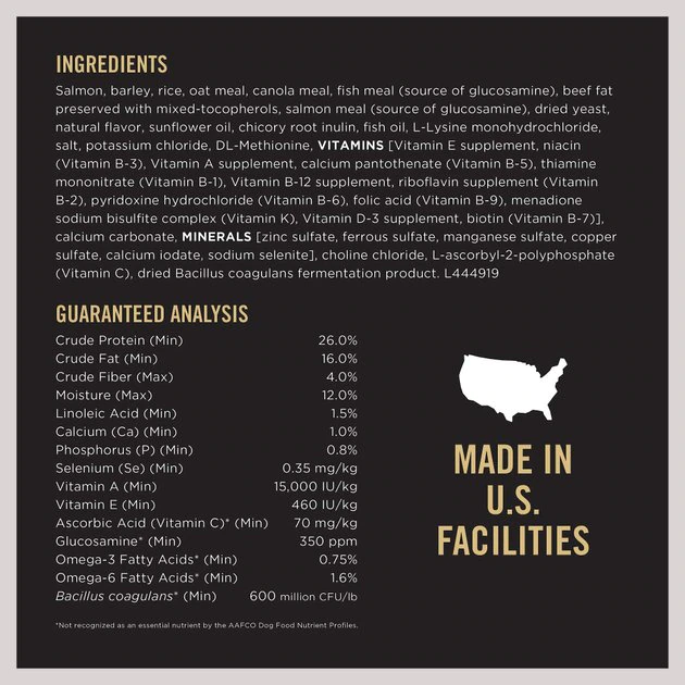 Salmon, Barley, Rice, Oat Meal, Canola Meal, Fish Meal (Source Of Glucosamine), Beef Fat Preserved With Mixed-tocopherols, Salmon Meal (Source Of Glucosamine), Dried Yeast, Natural Flavor, Sunflower Oil, Chicory Root Inulin, Fish Oil, L-lysine Monohydrochloride, Salt, Potassium Chloride, Dl-methionine, Vitamins [Vitamin E Supplement, Niacin (Vitamin B-3), Vitamin A Supplement, Calcium Pantothenate (Vitamin B-5), Thiamine Mononitrate (Vitamin B-1), Vitamin B-12 Supplement, Riboflavin Supplement (Vitamin B-2), Pyridoxine Hydrochloride (Vitamin B-6), Folic Acid (Vitamin B-9), Menadione Sodium Bisulfite Complex (Vitamin K), Vitamin D-3 Supplement, Biotin (Vitamin B-7)], Calcium Carbonate, Minerals [Zinc Sulfate, Ferrous Sulfate, Manganese Sulfate, Copper Sulfate, Calcium Iodate, Sodium Selenite], Choline Chloride, L-ascorbyl-2-polyphosphate (Vitamin C), Dried Bacillus Coagulans Fermentation Product..