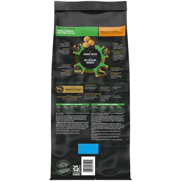 Give your small dog specialized nutrition with a taste he will love with Purina Pro Plan Brand Dog Food Small Breed Chicken and Rice Formula adult dry dog food. Real chicken helps provide protein, which is an essential building block within your dog’s body. This formula is high in protein, including chicken as the first ingredient, to meet the unique needs of your active small dog. Calcium, phosphorus and other minerals help to maintain his strong teeth and bones, so you can enjoy daily walks and games of fetch together. This super premium dog food features bite-sized kibble that’s nutrient dense to meet your dog’s needs, and the natural prebiotic fiber sourced from wheat bran helps to promote his digestive health. We also fortify this kibble with guaranteed live probiotics for digestive and immune health. Show your little dog he’s the center of your world, and watch as he enjoys every crunchy bite of this Purina Pro Plan Specialized recipe designed to meet his nutritional needs.