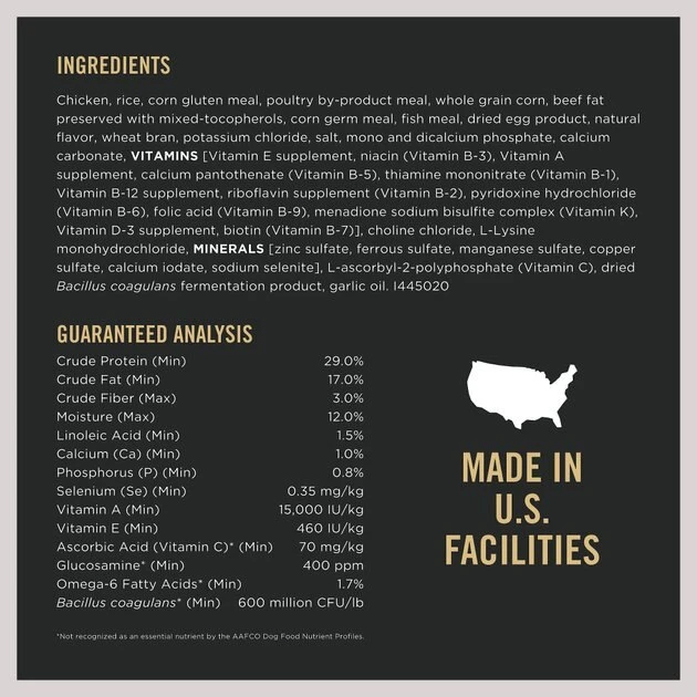 Chicken, Rice, Corn Gluten Meal, Poultry By-Product Meal, Whole Grain Corn, Beef Fat Preserved With Mixed-Tocopherols, Corn Germ Meal, Fish Meal, Dried Egg Product, Natural Flavor, Wheat Bran, Potassium Chloride, Salt, Mono And Dicalcium Phosphate, Calcium Carbonate, Vitamins [Vitamin E Supplement, Niacin (Vitamin B-3), Vitamin A Supplement, Calcium Pantothenate (Vitamin B-5), Thiamine Mononitrate (Vitamin B-1), Vitamin B-12 Supplement, Riboflavin Supplement (Vitamin B-2), Pyridoxine Hydrochloride (Vitamin B-6), Folic Acid (Vitamin B-9), Menadione Sodium Bisulfite Complex (Vitamin K), Vitamin D-3 Supplement, Biotin (Vitamin B-7)], Choline Chloride, L-Lysine Monohydrochloride, Minerals [Zinc Sulfate, Ferrous Sulfate, Manganese Sulfate, Copper Sulfate, Calcium Iodate, Sodium Selenite], L-Ascorbyl-2-Polyphosphate (Vitamin C), Dried Bacillus Coagulans Fermentation Product, Garlic Oil. I445020.