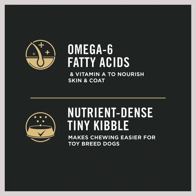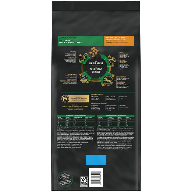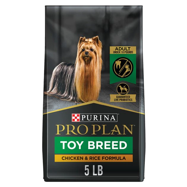 Deliver big taste and wholesome nutrition to your toy-breed dog’s bowl with Purina Pro Plan Brand Dog Food Toy Breed Chicken and Rice Formula adult dry dog food. Real chicken as the first ingredient helps provide protein, which is an essential building block, while the high level of protein helps maintain an ideal body condition. Fortified with guaranteed live probiotics for digestive and immune health, this mouthwatering formula features bits of bite-sized kibble that are easy for your toy breed to chew at feeding time and a delicious flavor that keeps him coming back for more. Every ingredient in this super premium dry dog food recipe is carefully chosen for a specific nutritional or functional purpose, giving your canine companion a high-quality meal option you can both appreciate. Formulated for adult toy-breed dogs weighing under 10 pounds, this Purina Pro Plan dry dog food offers specialized nutrition for your dog’s exceptional life.