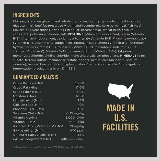 Chicken, Rice, Corn Gluten Meal, Whole Grain Corn, Poultry By-product Meal (Source Of Glucosamine), Beef Fat Preserved With Mixed-tocopherols, Corn Germ Meal, Fish Meal (Source Of Glucosamine), Dried Egg Product, Natural Flavor, Wheat Bran, Calcium Carbonate, Potassium Chloride, Salt, Vitamins [Vitamin E Supplement, Niacin (Vitamin B-3), Vitamin A Supplement, Calcium Pantothenate (Vitamin B-5), Thiamine Mononitrate (Vitamin B-1), Vitamin B-12 Supplement, Riboflavin Supplement (Vitamin B-2), Pyridoxine Hydrochloride (Vitamin B-6), Folic Acid (Vitamin B-9), Menadione Sodium Bisulfite Complex (Vitamin K), Vitamin D-3 Supplement, Biotin (Vitamin B-7)], L-lysine Monohydrochloride, Choline Chloride, Mono And Dicalcium Phosphate, Minerals [Zinc Sulfate, Ferrous Sulfate, Manganese Sulfate, Copper Sulfate, Calcium Iodate, Sodium Selenite], Taurine, L-ascorbyl-2-polyphosphate (Vitamin C), Dried Bacillus Coagulans Fermentation Product, Garlic Oil. D448319.