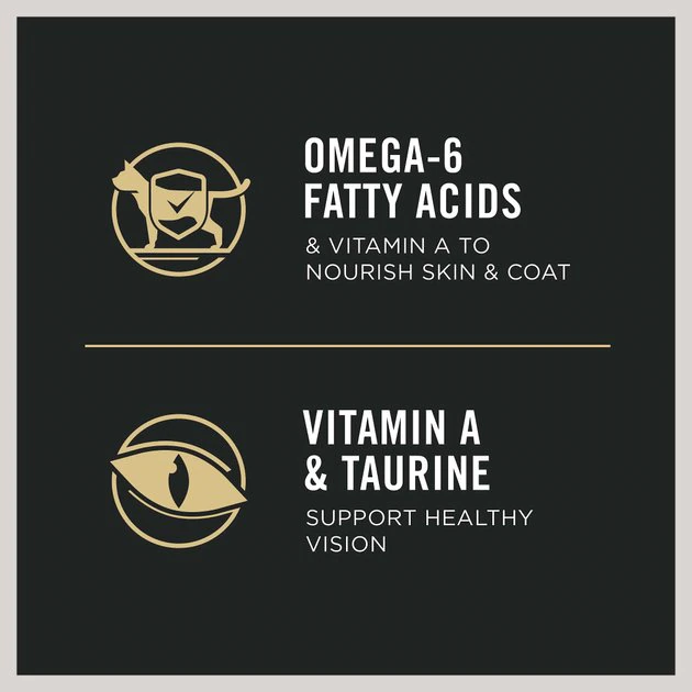 - Omega-6 fatty acids and vitamin A nourish your furry friend’s healthy skin and soft coat, while vitamin A and taurine help maintain her keen vision as she plays and pounces.