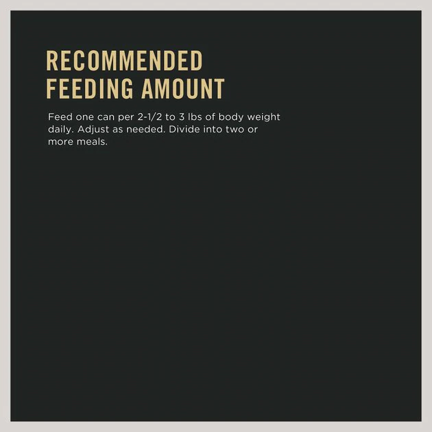Feed one can per 2 1/2 to 3 lbs of body weight daily. Adjust as needed. Divide into two or more meals.
