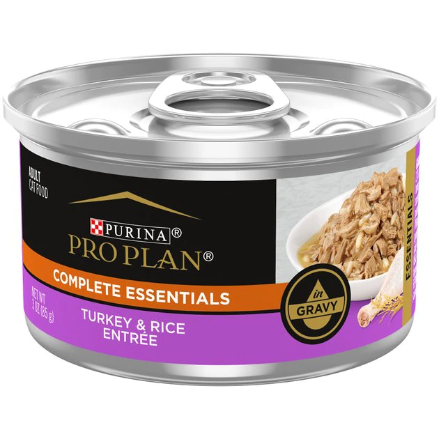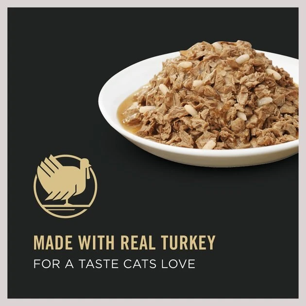 Serve kitty the essentials for delicious, nutritious meals with Purina Pro Plan Turkey & Rice Entree in Gravy Adult Wet Cat Food. Full of yummy goodness, this premium cat food is made with all high-quality ingredients chosen for a specific purpose, including real turkey and rice. She gets omega-6 fatty acids and vitamin A to nourish her skin and super-soft coat. Vitamin A and taurine help maintain her healthy vision as she explores her world, and antioxidants help support her immune system. Plus, each serving of this gravy cat food has the optimal level of protein to help her keep up her ideal body condition, lending a helping hand to a lifetime of jumping and playing. Best of all, this soft cat food is loaded with tender texture and yummy flavor sure to rock your kitty’s world.