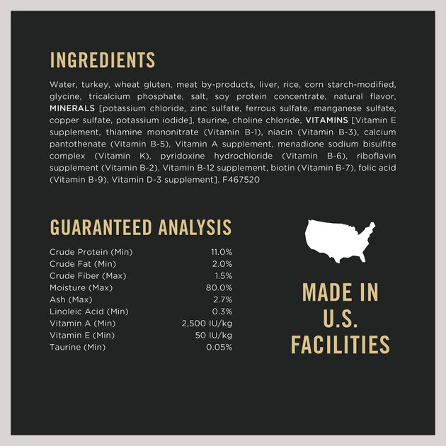 Water, Turkey, Wheat Gluten, Meat By-Products, Liver, Rice, Corn Starch-Modified, Glycine, Tricalcium Phosphate, Salt, Soy Protein Concentrate, Natural Flavor, Minerals [Potassium Chloride, Zinc Sulfate, Ferrous Sulfate, Manganese Sulfate, Copper Sulfate, Potassium Iodide], Taurine, Choline Chloride, Vitamins [Vitamin E Supplement, Thiamine Mononitrate (Vitamin B-1), Niacin (Vitamin B-3), Calcium Pantothenate (Vitamin B-5), Vitamin A Supplement, Menadione Sodium Bisulfite Complex (Vitamin K), Pyridoxine Hydrochloride (Vitamin B-6), Riboflavin Supplement (Vitamin B-2), Vitamin B-12 Supplement, Biotin (Vitamin B-7), Folic Acid (Vitamin B-9), Vitamin D-3 Supplement]. F467520.