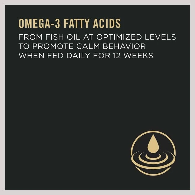 - Purina dry dog food featuring Omega-3 fatty acids at optimized levels helps promote calm behavior when fed daily for 12 weeks.