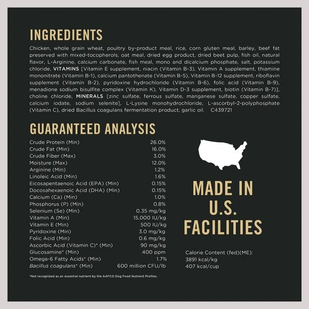 Chicken, Whole Grain Wheat, Poultry By-Product Meal, Rice, Corn Gluten Meal, Barley, Beef Fat Preserved With Mixed-Tocopherols, Oat Meal, Dried Egg Product, Dried Beet Pulp, Fish Oil, Natural Flavor, L-Arginine, Calcium Carbonate, Fish Meal, Mono And Dicalcium Phosphate, Salt, Potassium Chloride, VITAMINS [Vitamin E Supplement, Niacin (Vitamin B-3), Vitamin A Supplement, Thiamine Mononitrate (Vitamin B-1), Calcium Pantothenate (Vitamin B-5), Vitamin B-12 Supplement, Riboflavin Supplement (Vitamin B-2), Pyridoxine Hydrochloride (Vitamin B-6), Folic Acid (Vitamin B-9), Menadione Sodium Bisulfite Complex (Vitamin K), Vitamin D-3 Supplement, Biotin (Vitamin B-7)], Choline Chloride, MINERALS [Zinc Sulfate, Ferrous Sulfate, Manganese Sulfate, Copper Sulfate, Calcium Iodate, Sodium Selenite]), L-Lysine Monohydrochloride, L-Ascorbyl-2-Polyphosphate (Vitamin C), Dried Bacillus Coagulans Fermentation Product, Garlic Oil. C439721