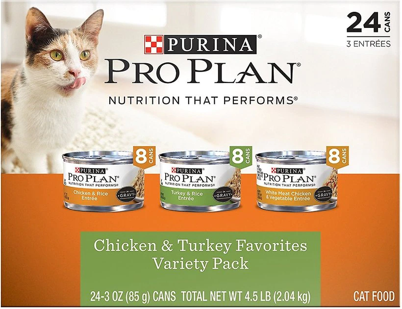 - Each recipe in the variety pack is crafted with either real turkey or chicken for the high-quality protein your cat needs to fuel her daily activities.